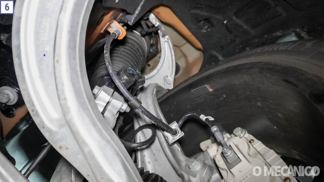 O conjunto de suspensão do Zeekr 001 é robusto, com sistema de braços sobrepostos, ou duplo A como é conhecida, em alumínio (5), com foco na resistência e diminuição de peso ao veículo.De acordo com Marcelino, para realizar a substituição dos pivôs de suspensão, provavelmente, será necessário a troca de parte do braço inferior da suspensão.