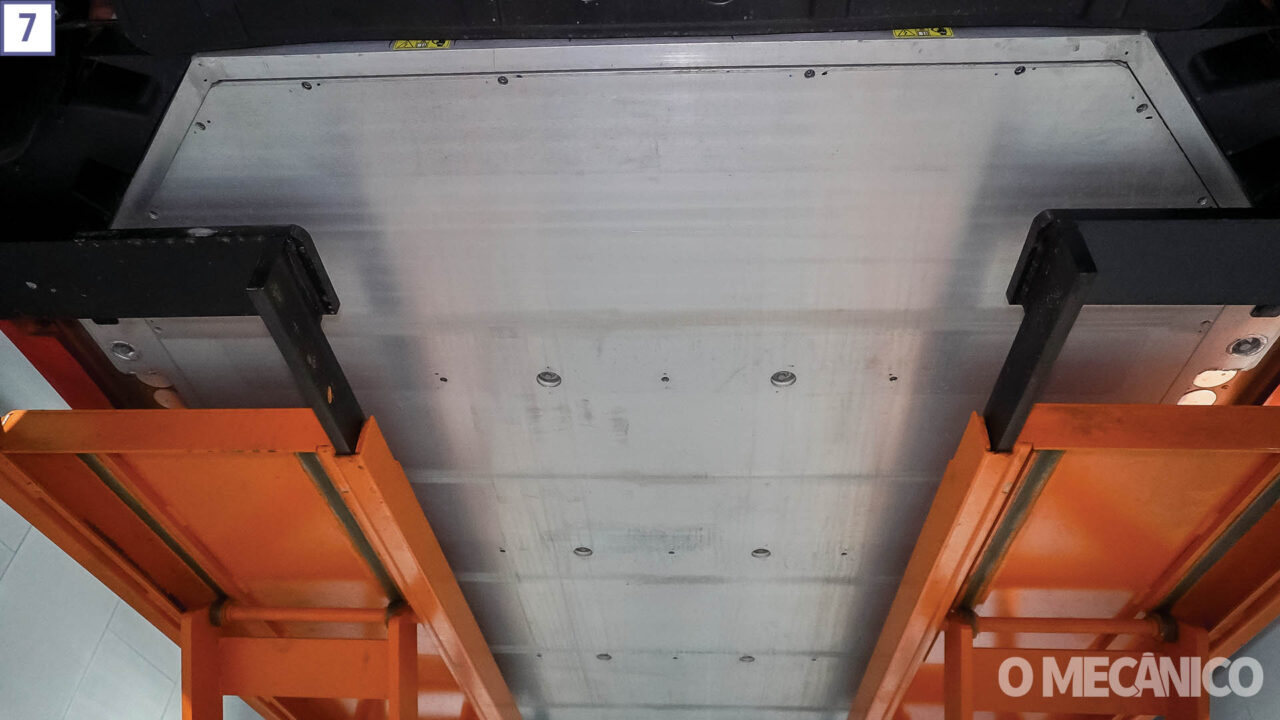 Para o sistema dianteiro, o veículo conta a construção comum de qualquer carro com bieleta, terminal de direção, semieixo, conector do sensor de ABS. Porém o que chama atenção é que o Zeekr 001 não utiliza amortecedores com molas helicoidais, mas sim, o sistema de suspensão a ar (6). Por ter uma área ampla e extensa de proteções por baixo do Zeekr 001, não é possível mostrar muitos detalhes, porém, o pack de baterias fica localizado na parte central (7) e com indicações para alertar que se trata de um componente com alta tensão.