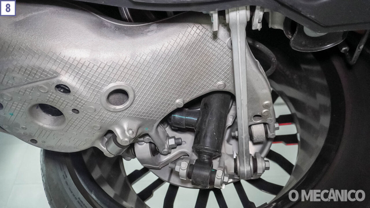 Por conta das proteções plásticas também na parte traseira, não é possível verificar o motor elétrico no eixo traseiro. Todas essas proteções têm o intuído de melhorar a aerodinâmica do veículo.