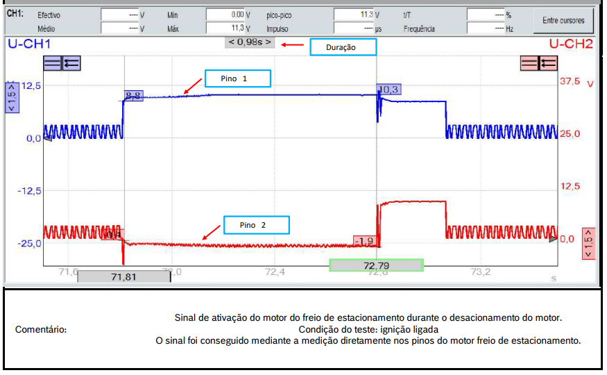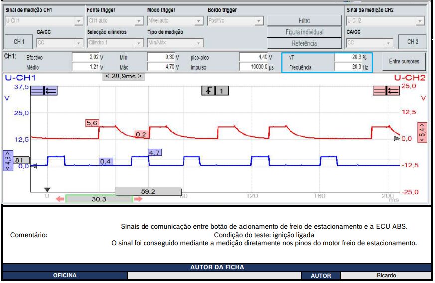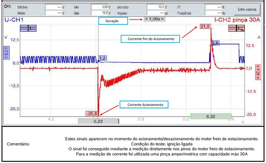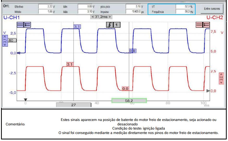 Depois, é útil verificar os sinais de posição do batente do motor, a corrente elétrica consumida durante o acionamento e os sinais de comunicação entre o botão de acionamento do freio de estacionamento e a ECU do sistema ABS, comparando os valores e formatos de onda obtidos com os valores de referência abaixo.
