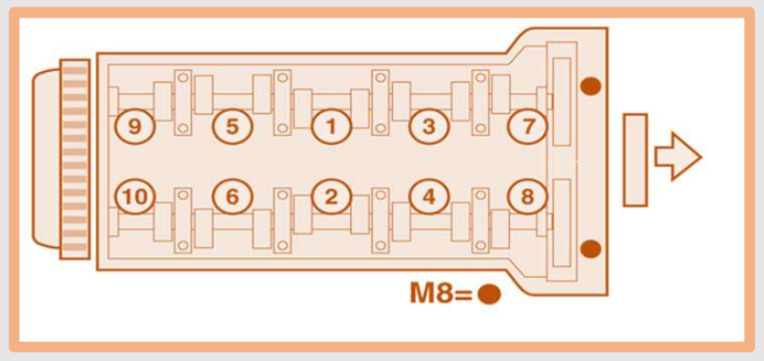 O procedimento de aperto do cabeçote é feito em quatro etapas, sempre seguindo a ordem de aperto dos parafusos conforme indicado pela imagem de referência. Na primeira etapa o torque aplicado é de 20 Nm, enquanto na segunda o valor é de 45 Nm. Já na terceira e quarta etapas o aperto é angular, com um ângulo de 90° em ambas. Depois, os parafusos M8 devem ser apertados com 20 Nm.