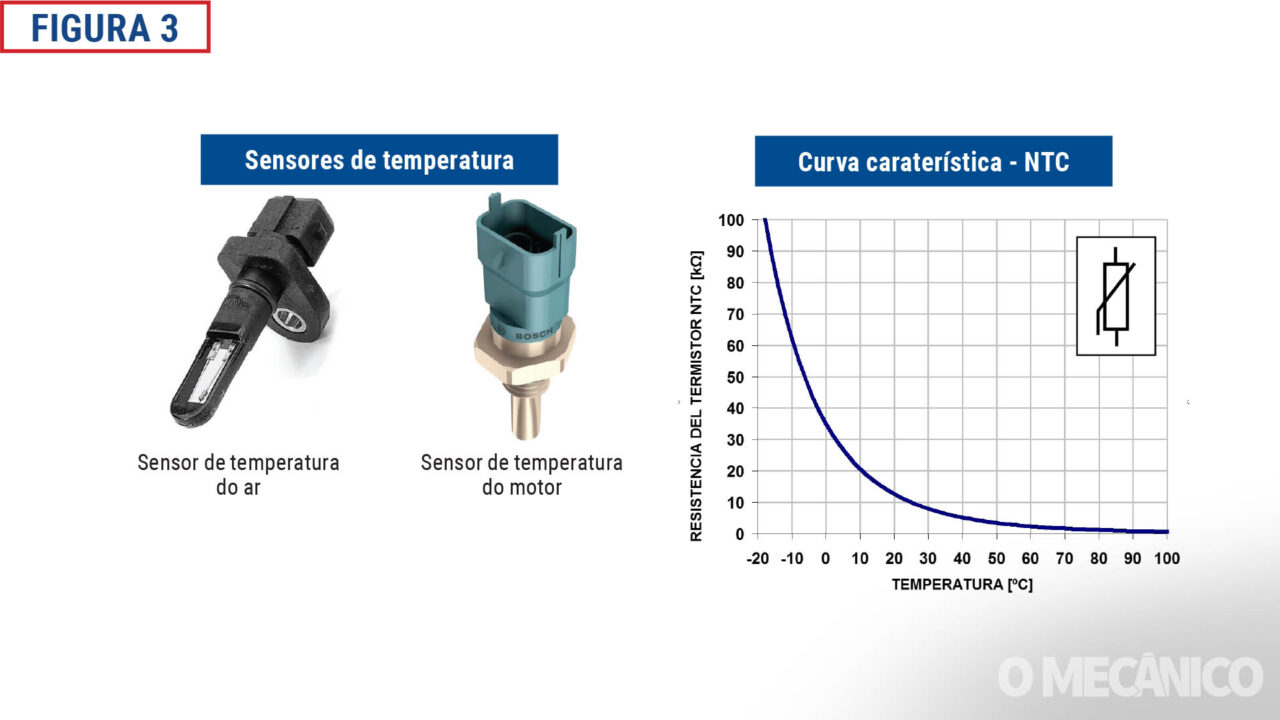A figura 3 mostra 2 exemplos de sensores de temperatura aplicados em motres de combustão interna, os quais têm a função de informar de forma precisa a temperatura presente no fluido, elemento com o qual o sensor têm contato direto; para o caso, estamos mostrando exemplos de sensores de temperatura do Ar de admissão, e sensores de temperatura de fluido de arrefecimento.