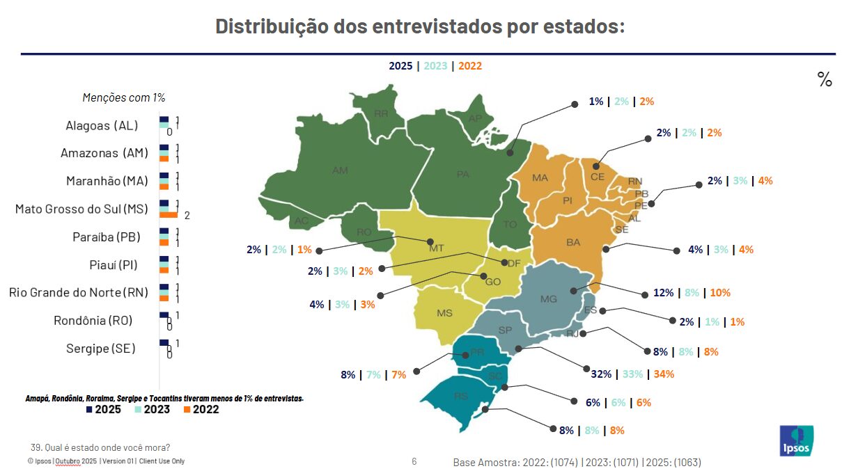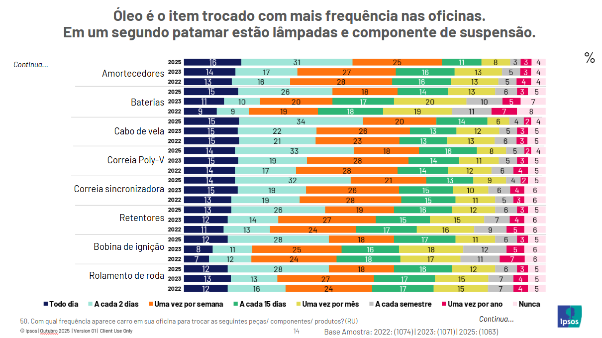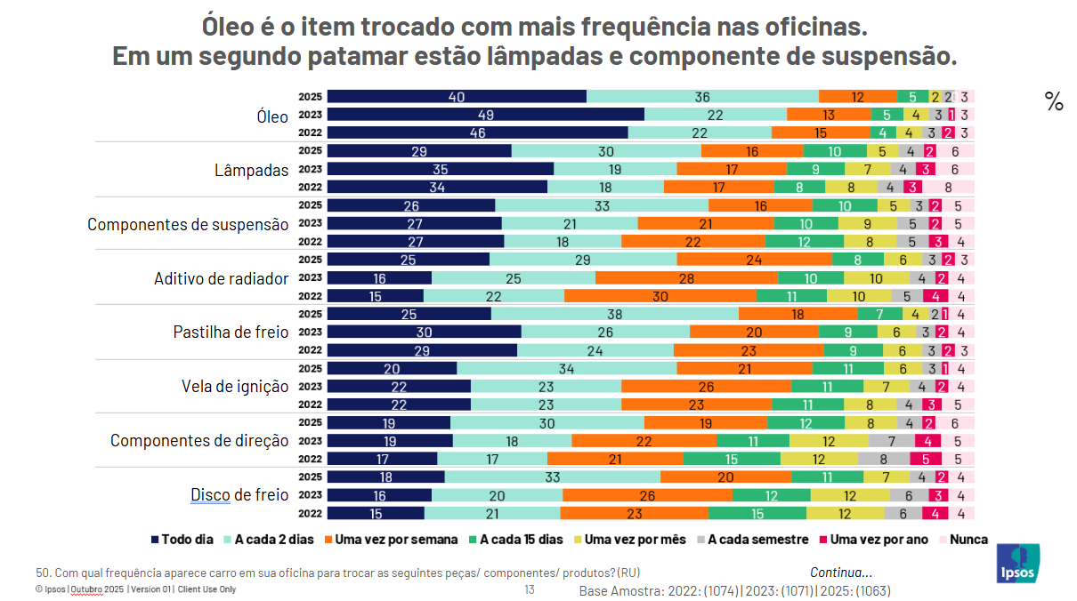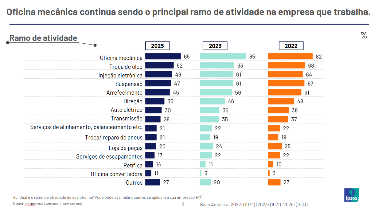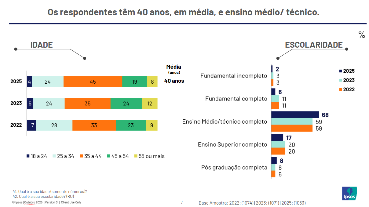 A metodologia adotada foi quantitativa, de autopreenchimento, realizada por meio de entrevistas online com profissionais da área mecânica de 18 anos ou mais, em todas as regiões do Brasil entre 11 de julho e 22 de setembro de 2025. Além disso, os participantes têm 40 anos em média e formação de ensino médio ou técnico. A margem de erro é de 3 pontos percentuais, com nível de confiança de 95%. A amostra foi ponderada para garantir proporcionalidade entre as áreas geográficas do país.